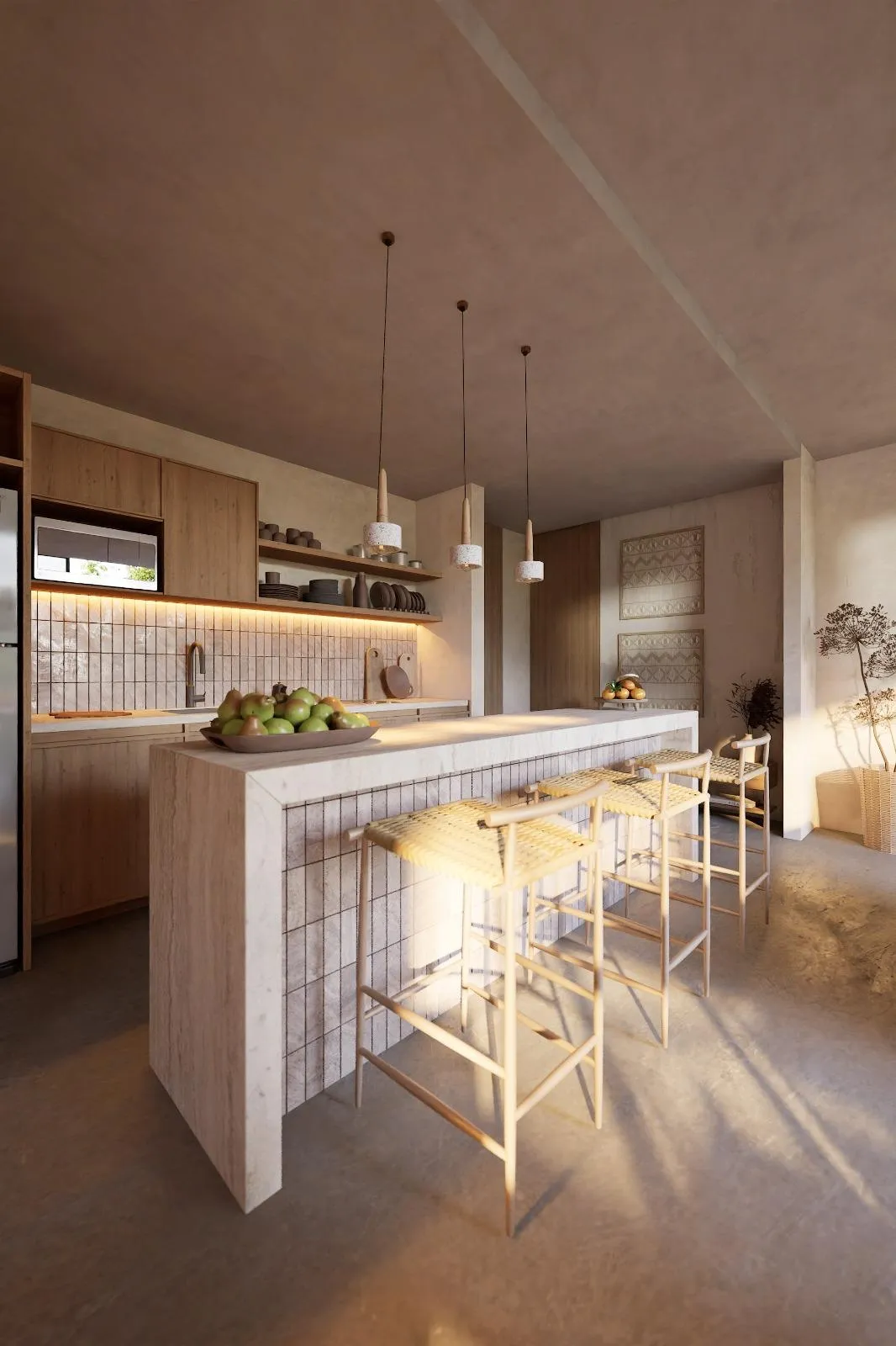 Arquitectura moderna, funcional y sustentable, integrando elementos naturales y materiales locales.