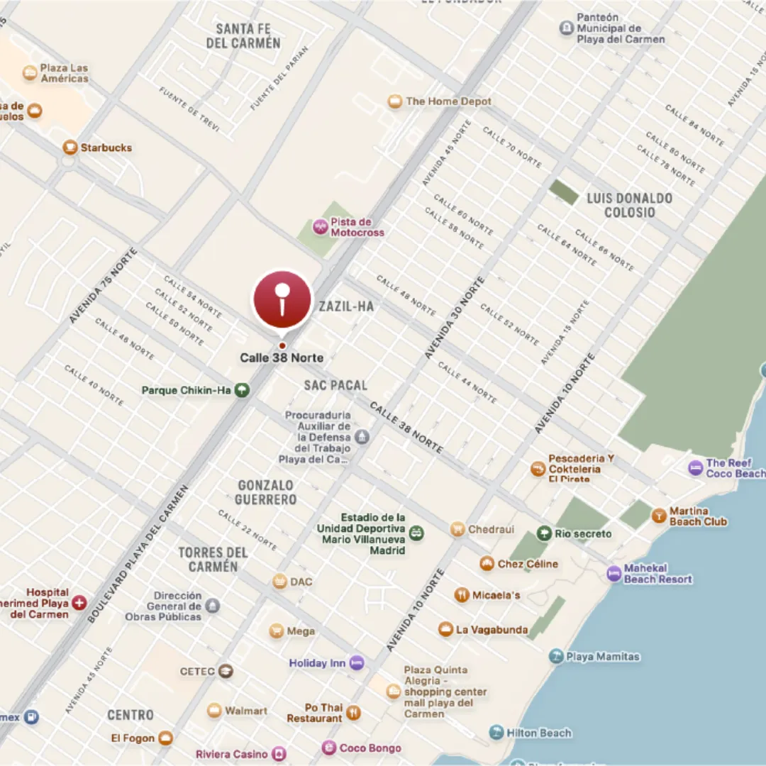 Calle 38 entre Avenida 10 y Avenida 115 Quintana Roo, México en el corazón de Playa del Carmen, Quintana Roo.